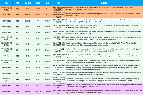 在消化系统肿瘤领域,凯发k8创新产品相关研究共入选2项口头报告、10项壁报和2项电子壁报,共14项研究。除了明星药物卡瑞利珠单抗和阿帕替尼外,还有5篇阿得贝利单抗治疗消化系统肿瘤的研究入选。此外,HRS-4642、瑞拉芙普-α注射液(SHR-1701)等未上市创新产品也有相应研究入选。随着新老药物前沿研究的不断推进,有望为消化系统肿瘤患者带来新的福音!